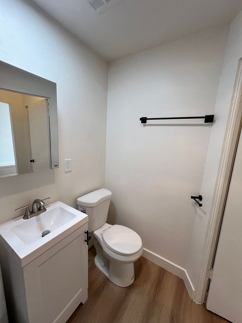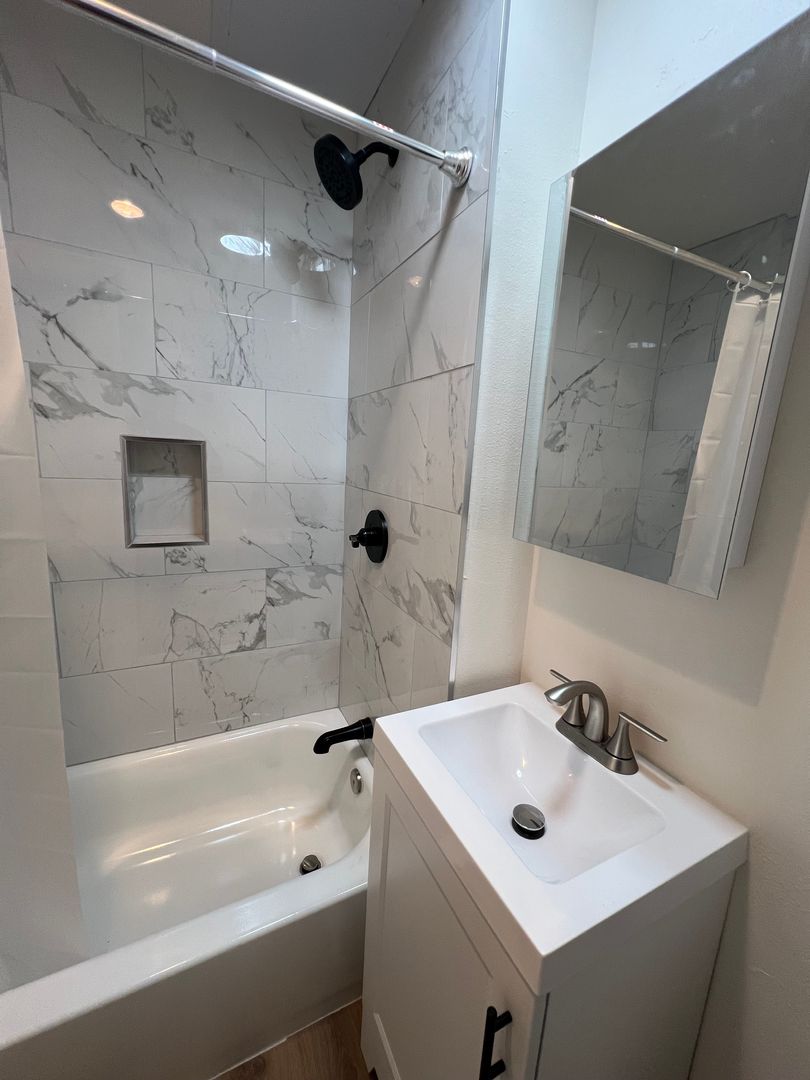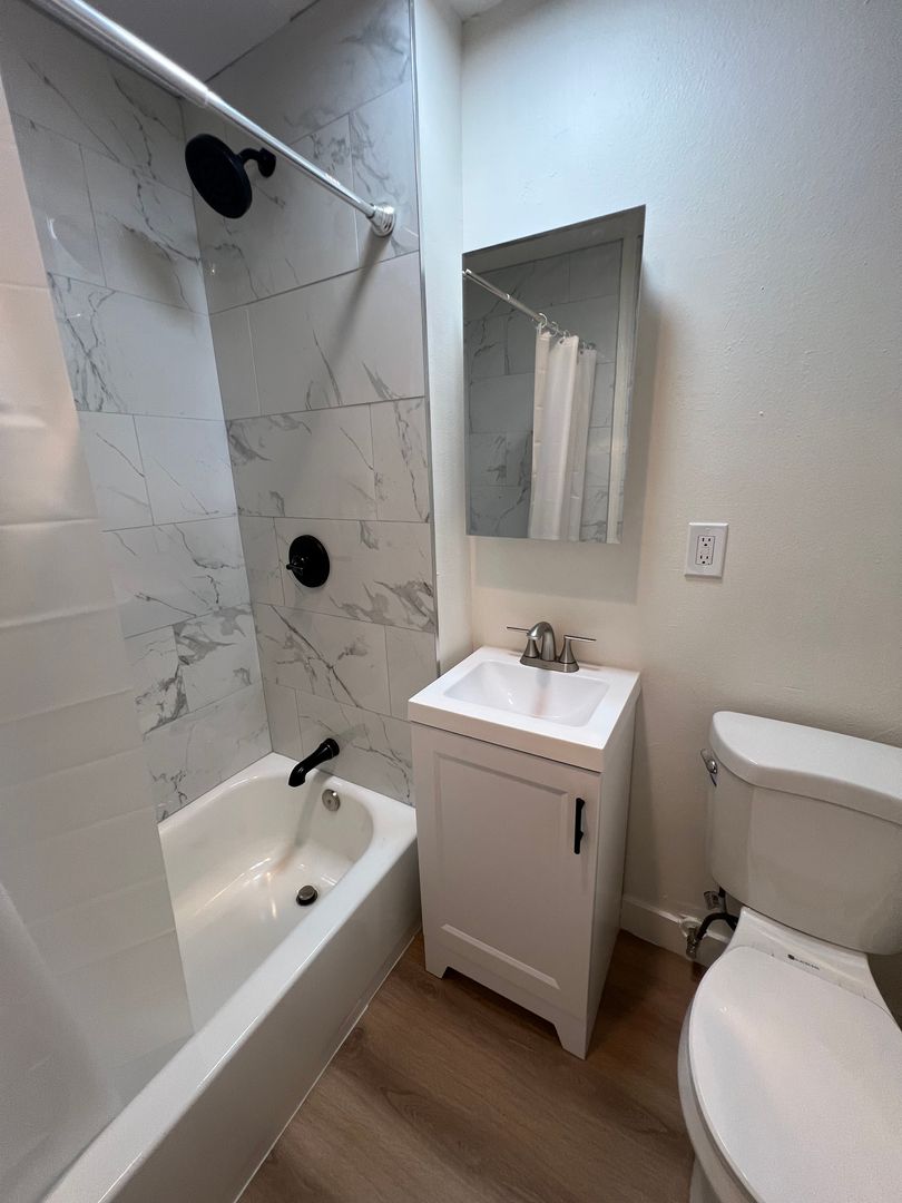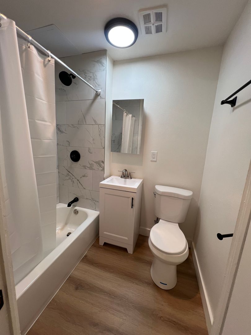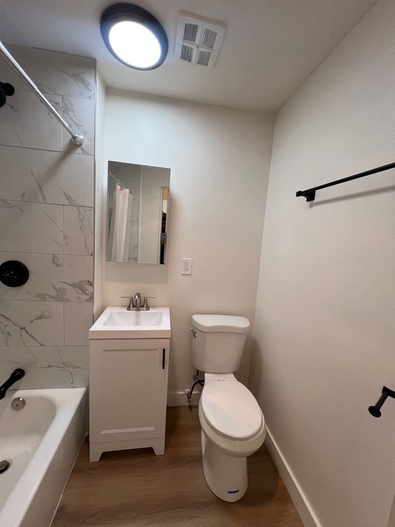 Spacious studio/ 1 bath on the second floor with balcony. New paint, new light fixtures, new verticals, new plank flooring, new kitchen cabinets and handles, new quartz counter top, new stainless steel sink with brushed nickel faucet, new stainless steel stove and new refrigerator, new kitchen cabinets and lots of closet space. The bathroom has been completely remodeled and updated, new tub, tub tile walls, new bath cabinet, new toilet and new medicine cabinet. Spacious living area for entertaining. This studio unit is centrally located in a beautiful apartment complex. Landlord PAYS ALL utilities!! The owner pays for the water, gas, electricity and trash.
