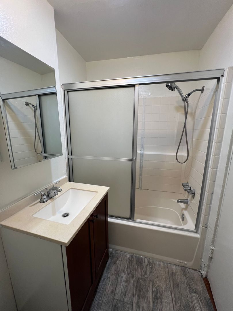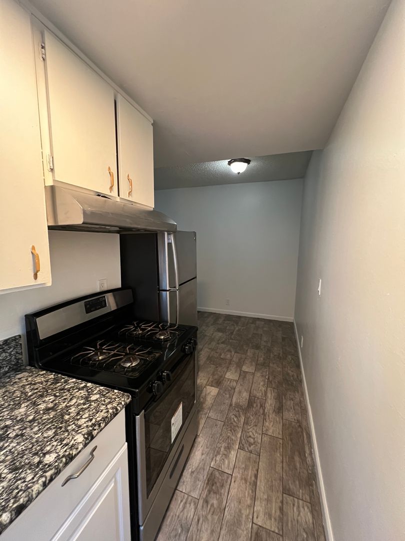 Spacious One Bedroom unit on the second floor with new paint, plank and laminate flooring, granite counter top, stainless steel stove and refrigerator, kitchen cabinets and lots of closet space. Mirrored closet doors in spacious bedroom. The bathroom is spacious with tub and shower, newer vanity and medicine cabinet. Spacious living room for entertaining. This One Bedroom unit is centrally located in a beautiful apartment complex. Master metered property and the owner pays for the water, gas, electricity and trash.